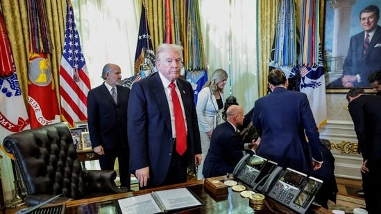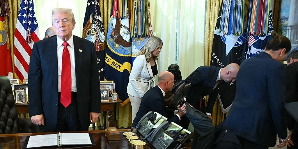 Because the cameras and reporters were cleared out, we don't have any idea of how long Trump was standing like a statue behind his desk. But there are enough pictures that let us know that he was standing looking away for a long time.