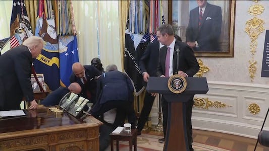 One of the drug manufacturer's representatives was talking about Trump's plan to lower drug prices, when behind him, another man started passing out and people immediately reacted and caught him, lowering him gently to the floor. Donald Trump watched for a second then stood behind his desk looking away until the room was cleared and the man was resuscitated.