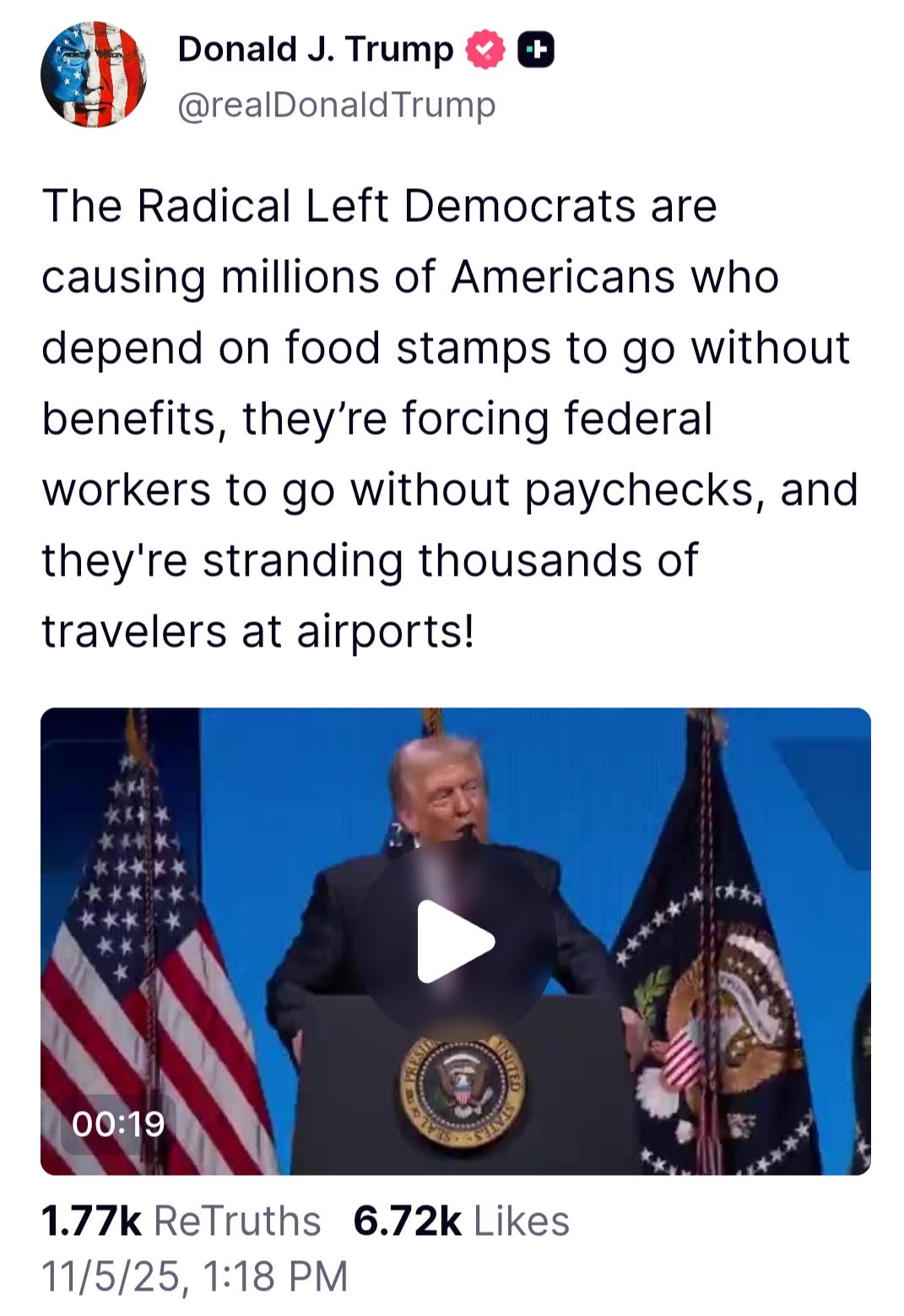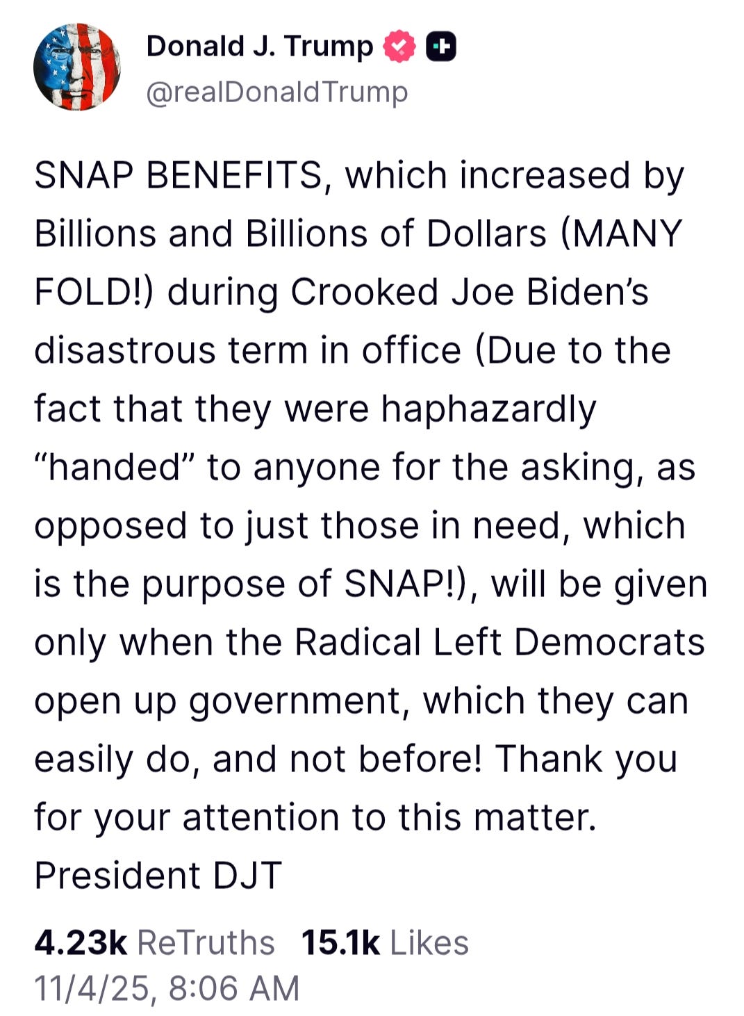 White House spokesperson Karoline Leavitt said after Trump's post, that she had just talked with Trump, and the benefits were going to be restored. Then, the story was that they could only do half the benefits. Trump, of course then blamed the whole problem on the Democrats.