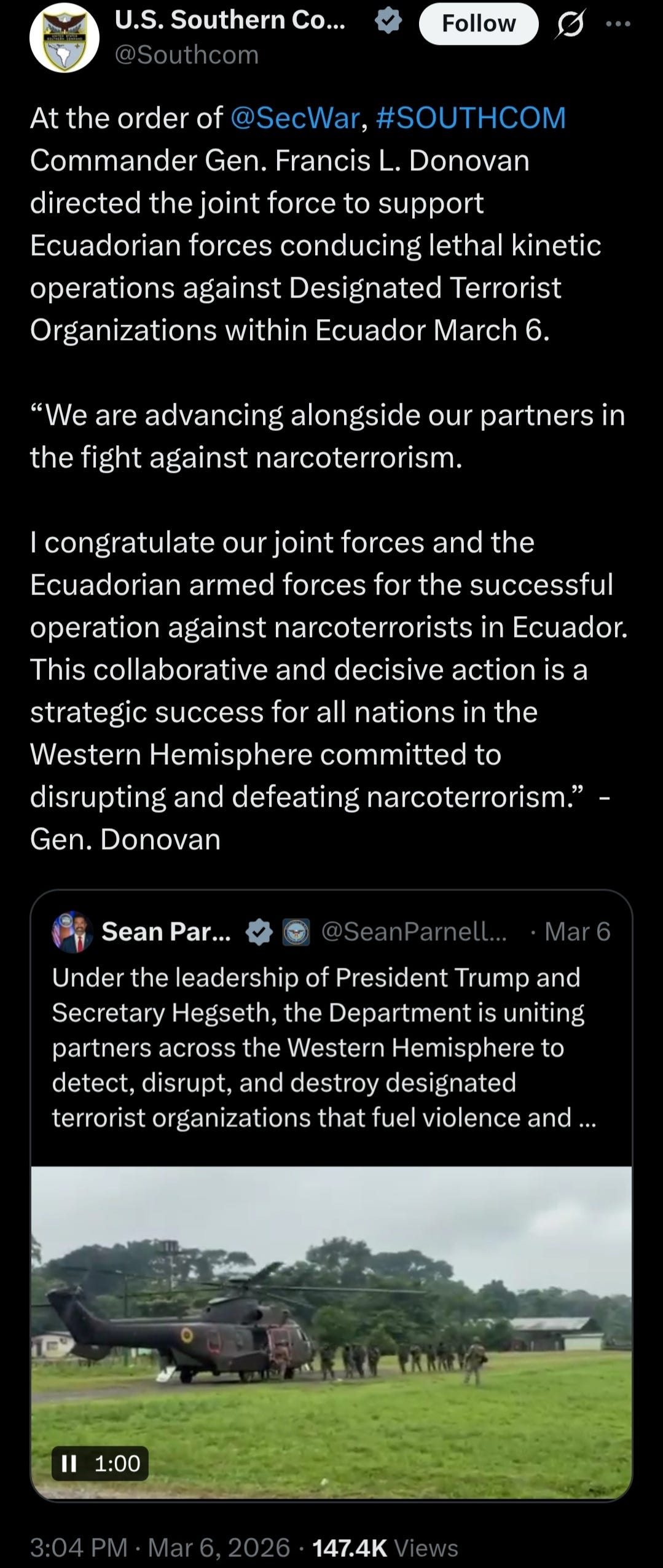 We just started another narco-terrorist war with boots on the ground in Ecuador.