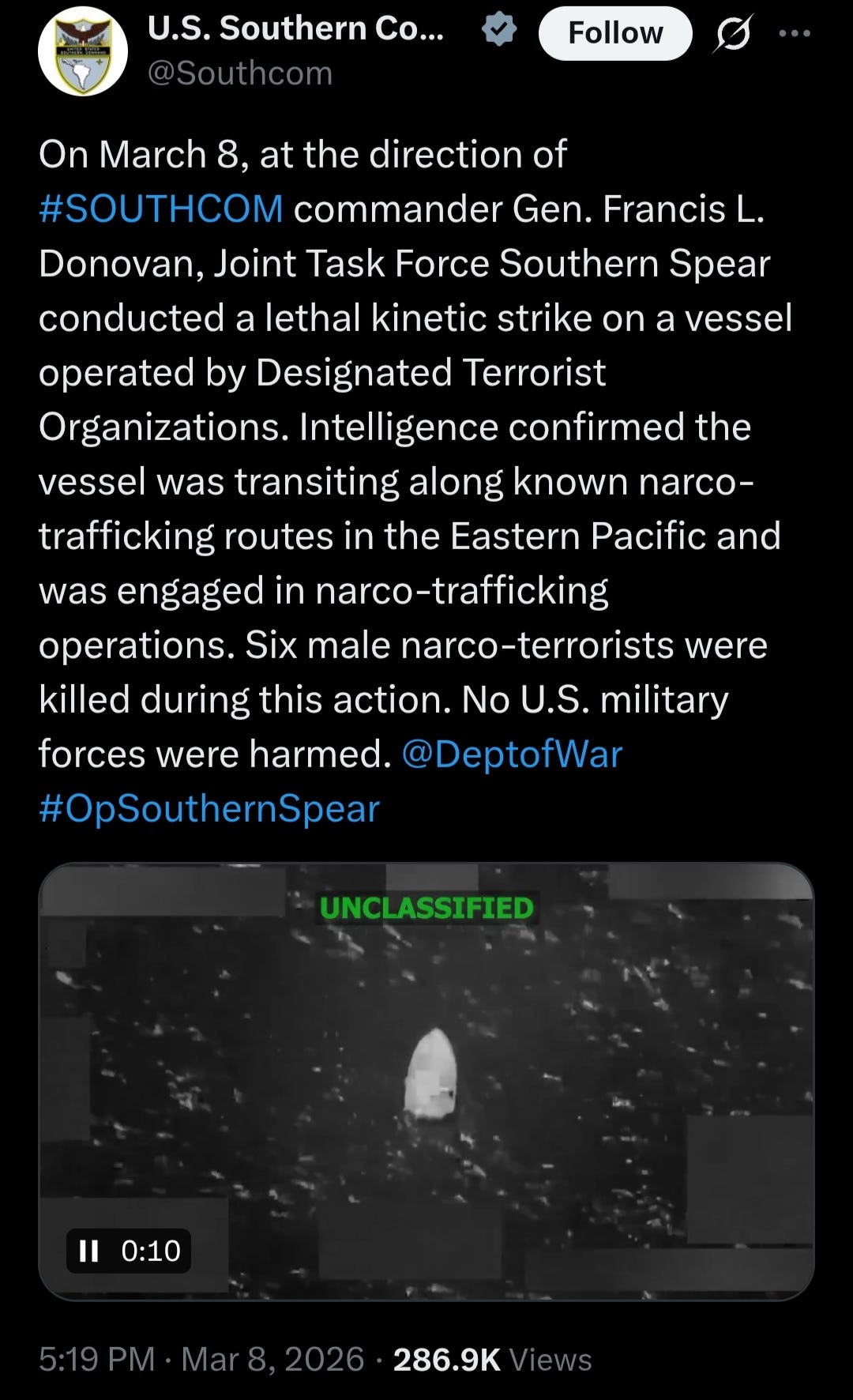 I’ve lost track of how many boats have been destroyed and how many people killed extrajudicially. What catches my eye on this one is that the boat was not moving. There is only one engine you can see, maybe two. Six people on a boat that is not moving and has maybe two engines, is not running drugs. Normally, the drug boats have four or five engines and only two or three crew on board. Add it up. It doesn't make sense that this could have been a drug boat.